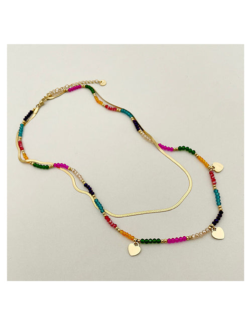 Collar doble, una cadena dorada de acero inoxidable y otro collar con cristales de colores y corazones color dorado.