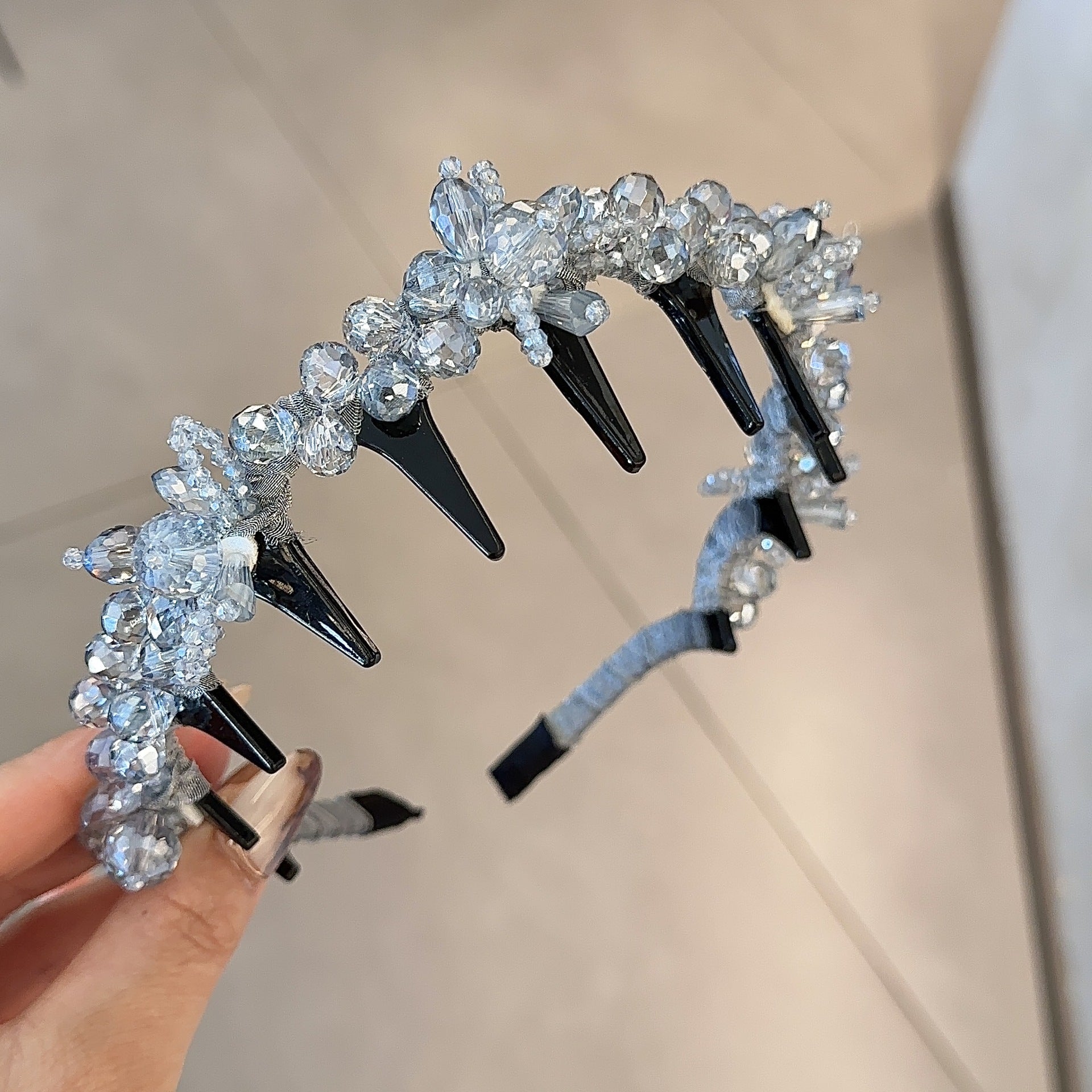 Una diadema totalmente hecha de cristal en una base de acrílico negro que hará relucir los cristales siendo los protagonistas.