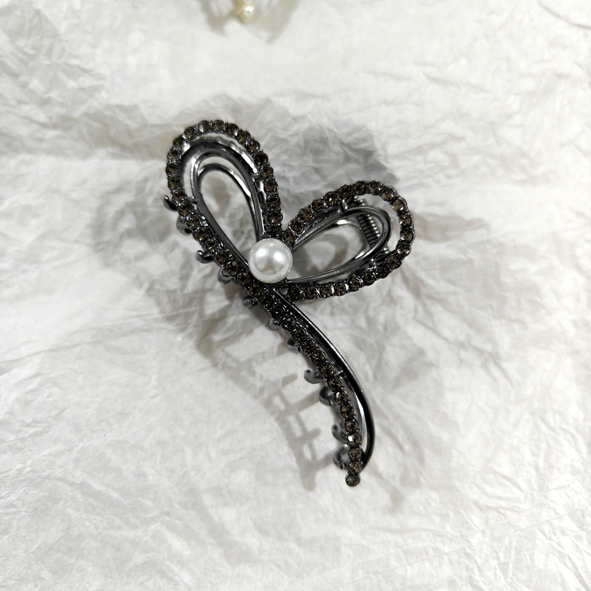 Hermosa pinza de metal con cristales negros y un detalle aperlado el cual hace única esta pinza. Su agarre es perfecto para las que tenemos mucho cabello, con esta pinza ya no sufrirás de un cabello rebelde y esponjado.